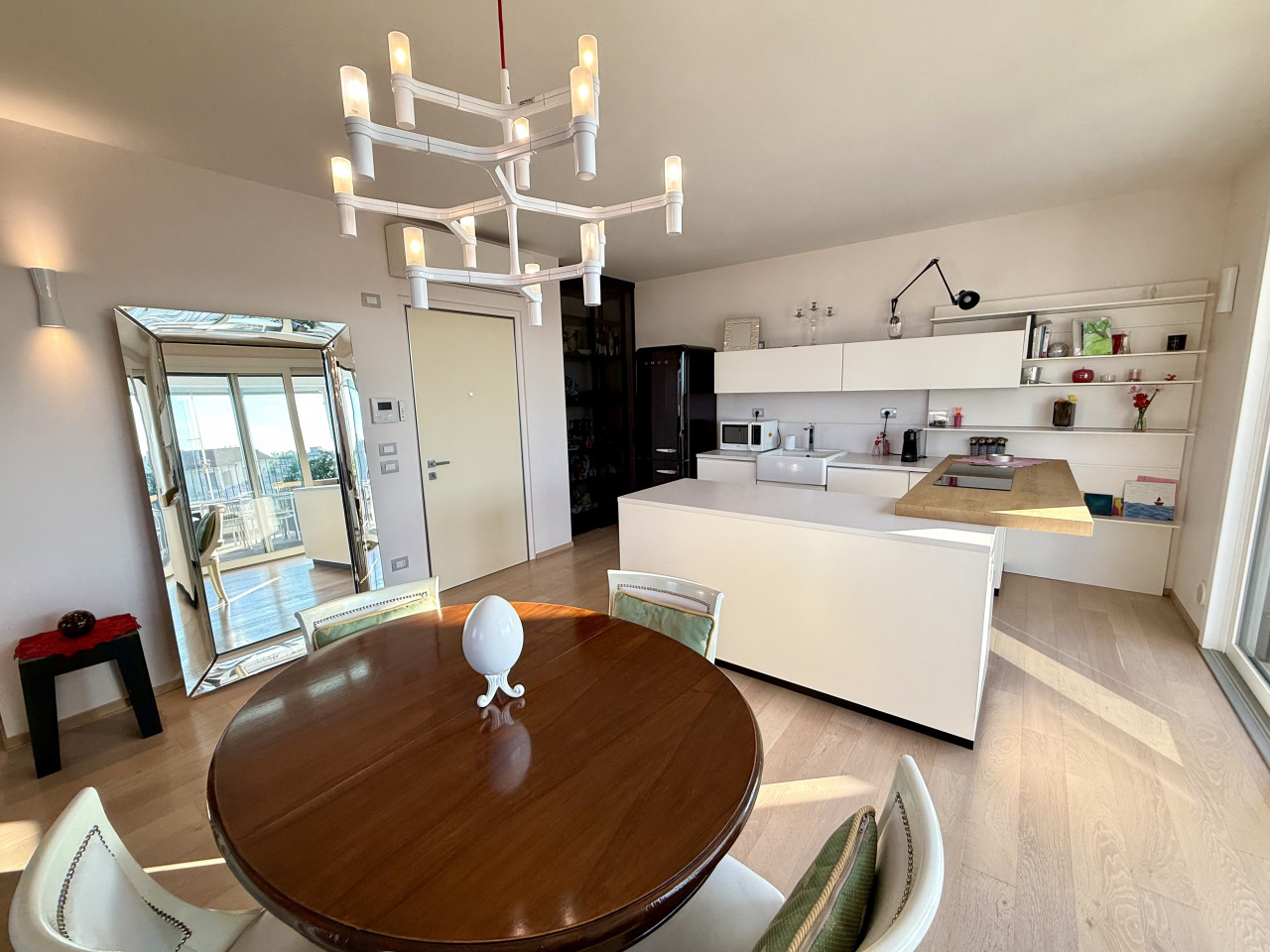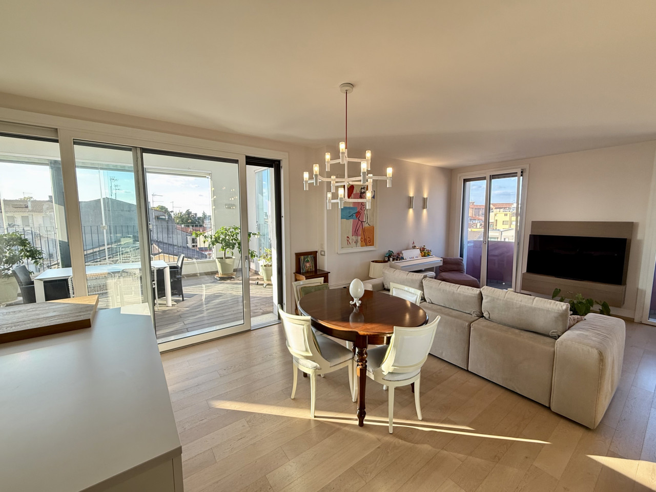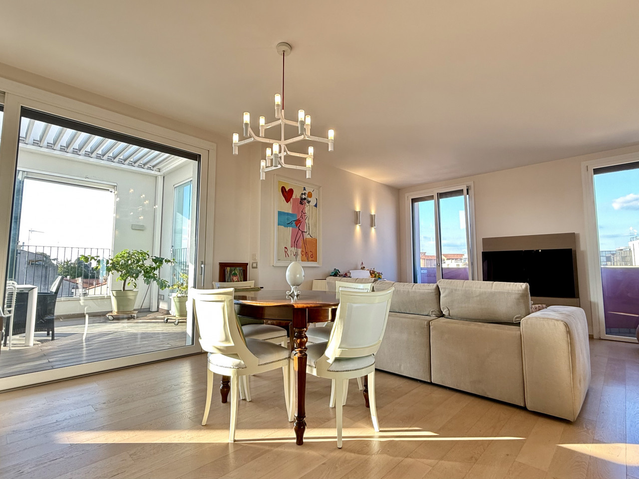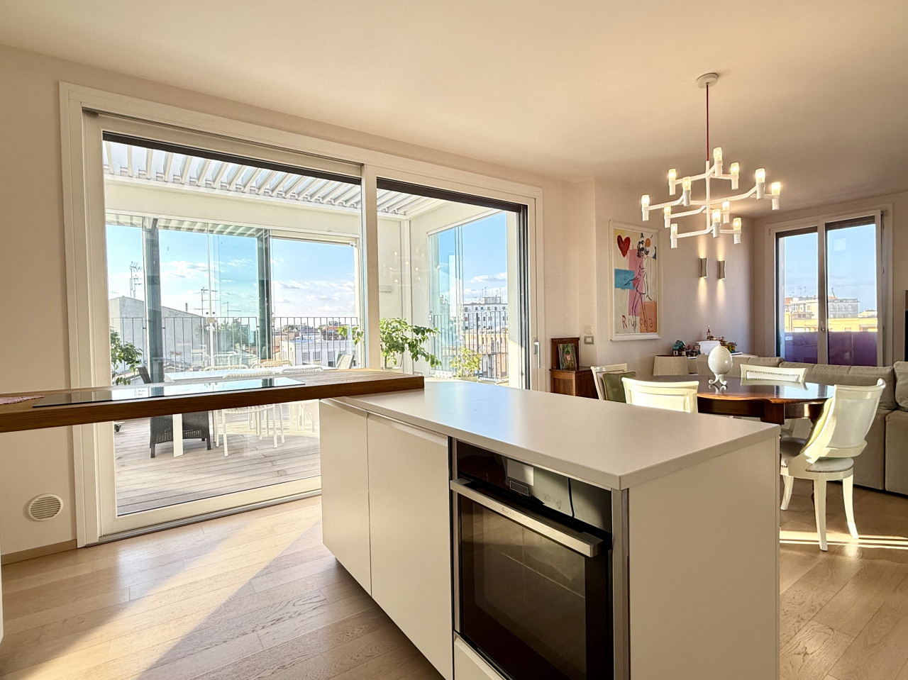 L'appartamento è di circa 150 mq, si apre su una zona living con un'ottima luce naturale, composta dalla cucina con isola a vista, un comodo soggiorno, dotato di doppio balcone, sala da pranzo e una terrazza di circa 30 mq, con pavimentazione in Tek ideale per organizzare cene e aperitivi durante la bella stagione.