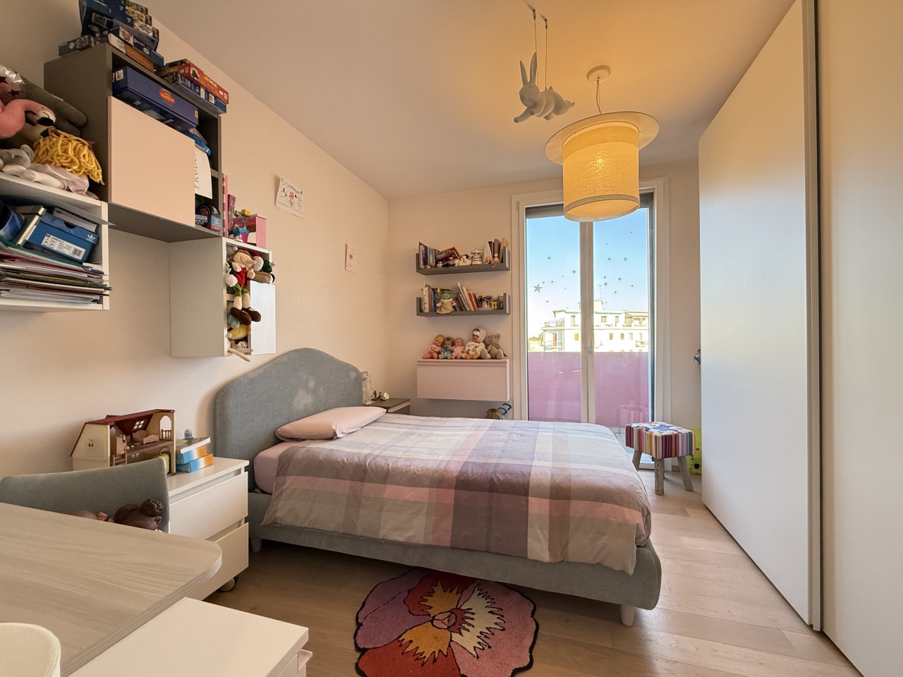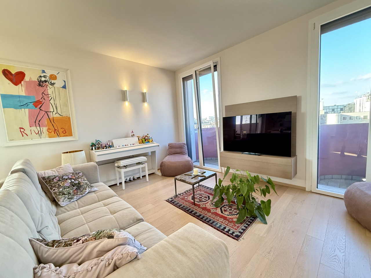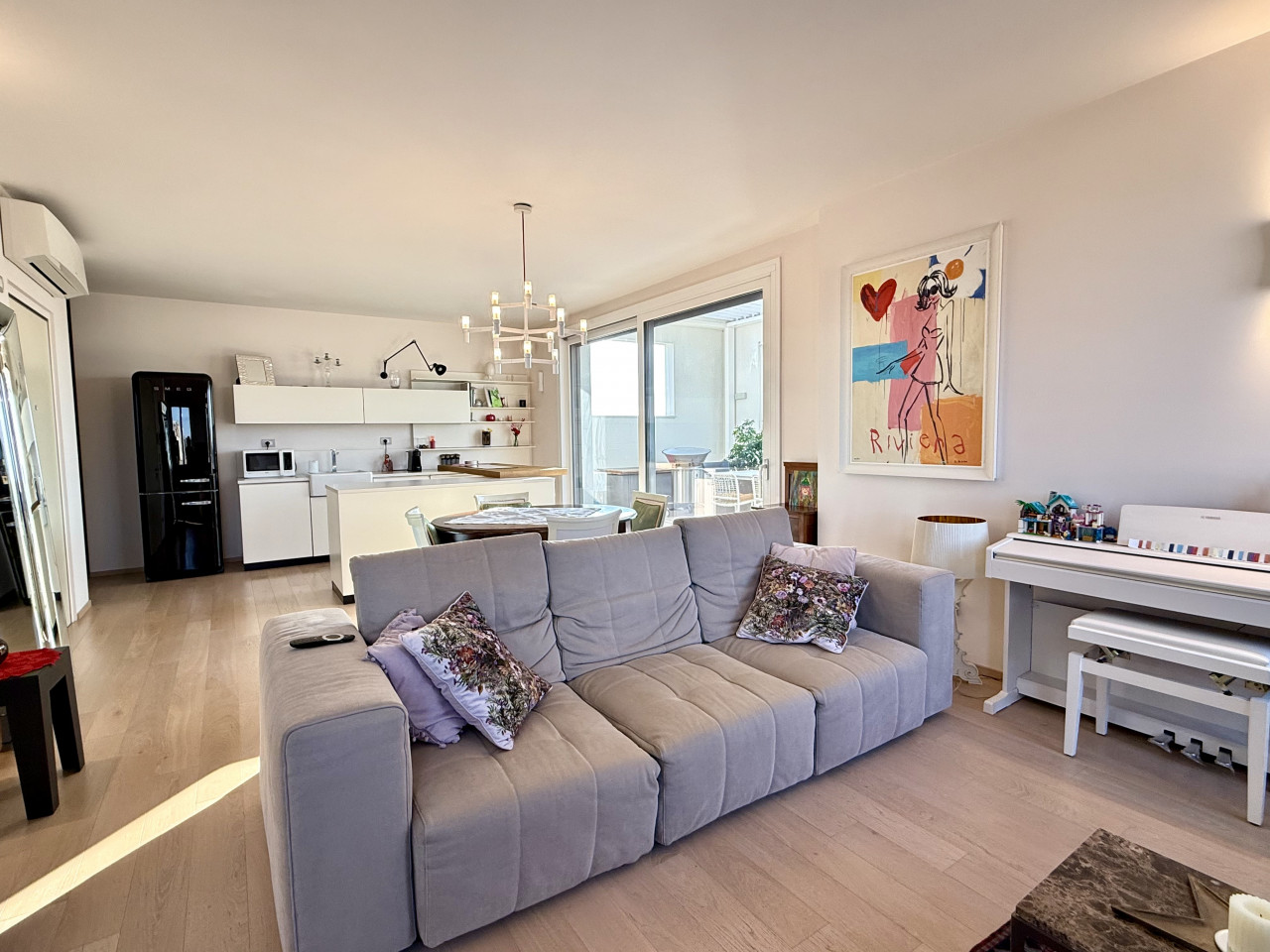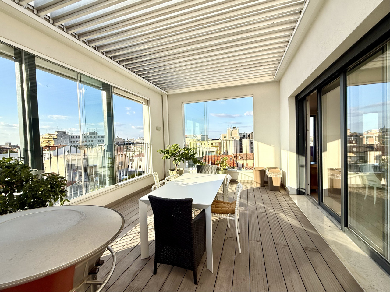 L'appartamento è di circa 150 mq, si apre su una zona living con un'ottima luce naturale, composta dalla cucina con isola a vista, un comodo soggiorno, dotato di doppio balcone, sala da pranzo e una terrazza di circa 30 mq, con pavimentazione in Tek ideale per organizzare cene e aperitivi durante la bella stagione.