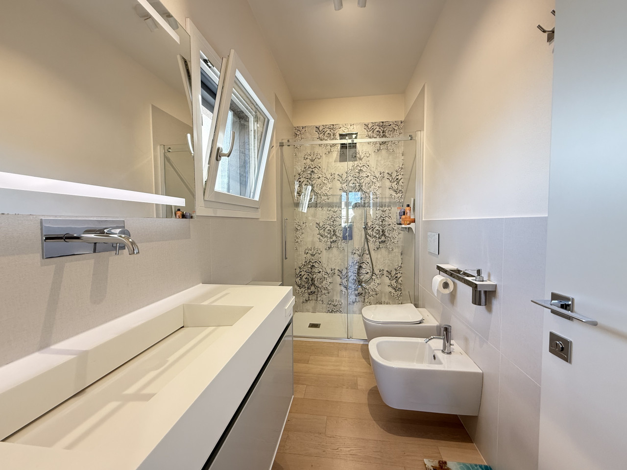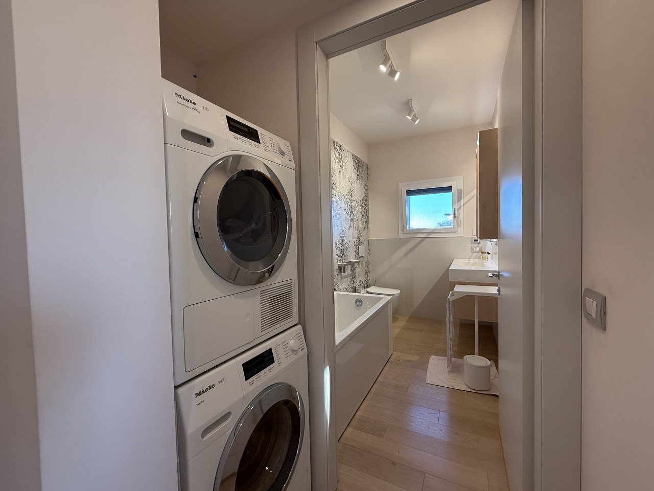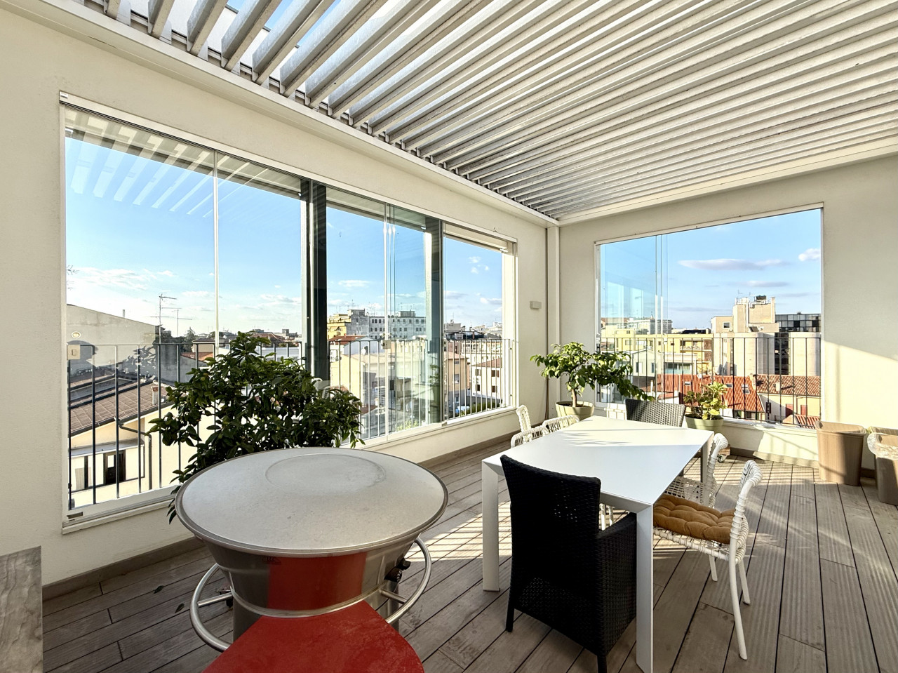 L'attico vanta finiture di prestigio, quali un parquet in rovere chiaro di listone giordano lungo tutta l'abitazione, impianto di domotica, tende motorizzate e oscuranti, anche in terrazza, impianto di raffrescamento in ogni stanza, e viene venduto completo degli arredi su misura, quali la cucina Mesos, vetrina dispensa, di impianto di illuminazione finito con marchi come Flos e Artemide, bagni completi di Lupi. Compreso nel prezzo anche il garage doppio al piano seminterrato con basculante motorizzata e un'ampia cantina di circa 7 mq.