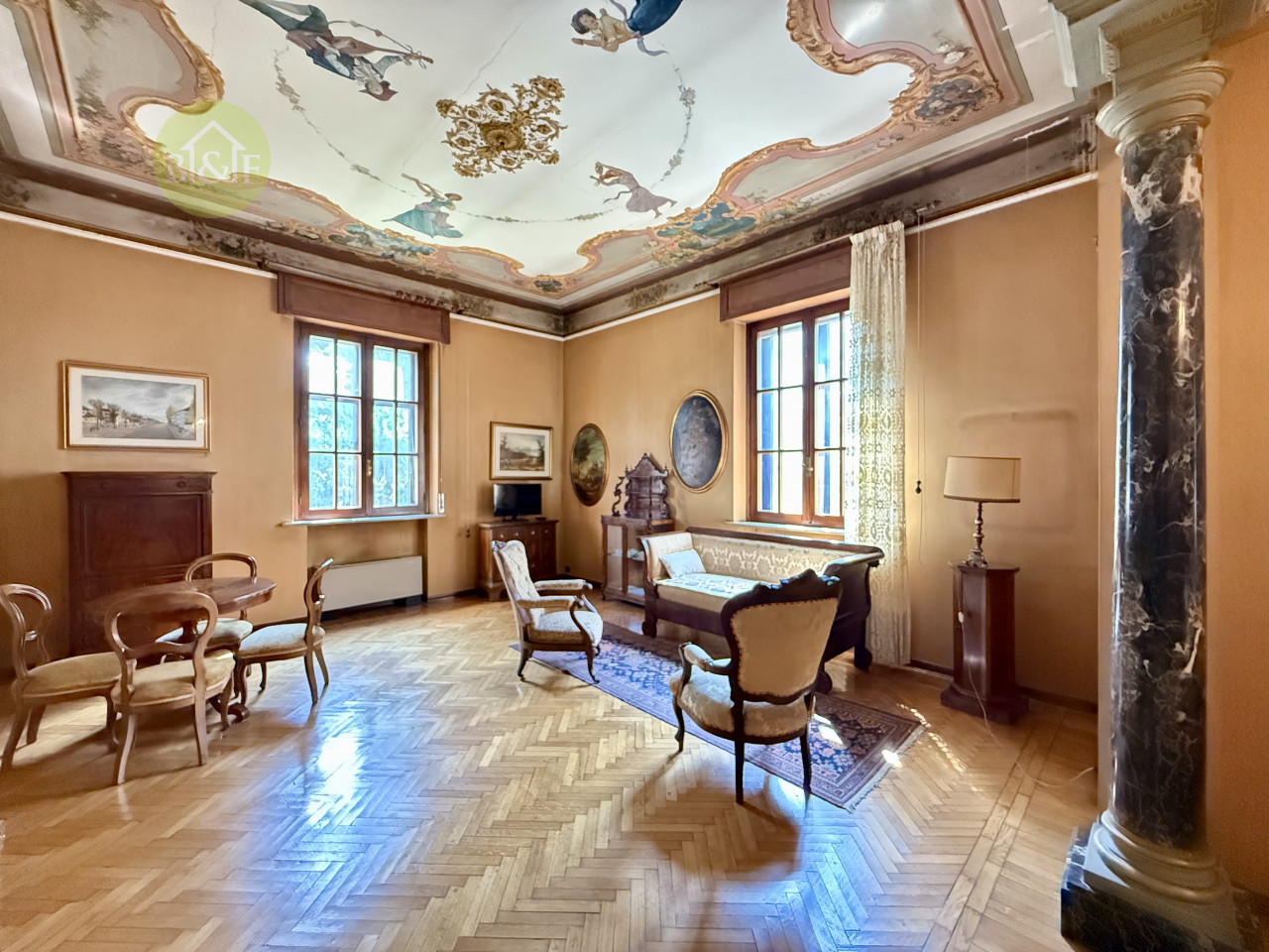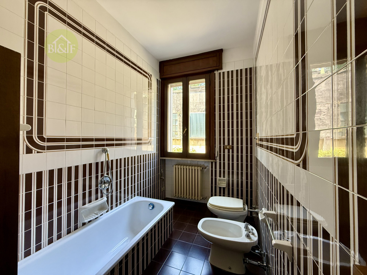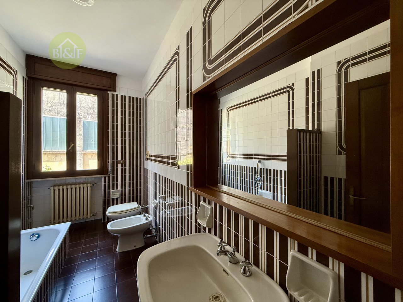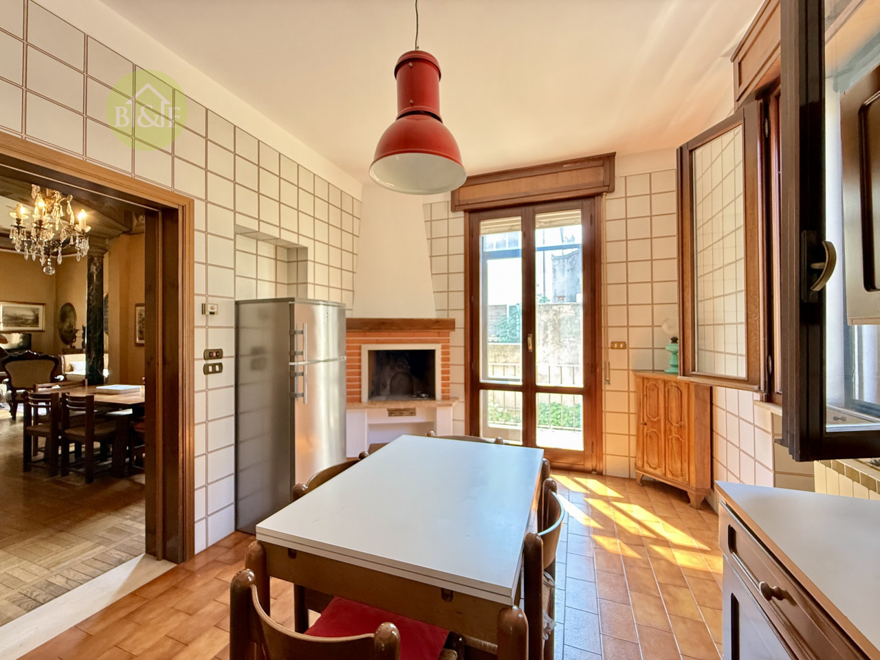 LEGNAGO, Viale dei Tigli: appartamento in villa bifamiliare degli anni '30. Inserito al piano rialzato di una elegante villa affacciata su una delle strade più caratteristiche del centro di Legnago, Viale dei Tigli. Si accede alla proprietà dal giardino in comune con l'altra abitazione, qualche scalino porta all'entrata principale dove troviamo un atrio privato pre-ingresso; all'interno gli ambienti sono caratterizzati da finiture originali dell'epoca, gli incantevoli soffitti affrescati, le colonne e il pavimento in legno posato a spina di pesce creano un ambiente unico, le finestre a doppia altezza rendono molto luminosa tutta l'abitazione. Una grande zona giorno ci accoglie offrendo molto spazio per un living collegato alla zona pranzo che può comodamente ospitare un tavolo per 8 persone; qui troviamo l'ampia cucina abitabile e separata dove é possibile uscire nel balcone, dotato di accesso laterale direttamente dal giardino. Un ampio disimpegno, dove sono stati posizionati degli armadi a muro, porta alla zona notte che si compone da tre confortevoli camere: due matrimoniali di cui una con bagno privato e completo di doccia ed una spaziosa doppia; il secondo bagno è di generose dimensioni, c'è spazio per una vasca e doccia. Dall'interno accediamo al piano seminterrato mediante scala, qui due grandi ambienti open-space offrono spazio per una zona lavanderia, centrale termica e/o vano tecnico per gli impianti e per una taverna e/o locale hobby di oltre 70 mq complessivi con la possibilità di uscire nel retro della villa. All'esterno una porzione di fabbricato adiacente necessita di una ristrutturazione per essere utilizzato come garage e ripostiglio.