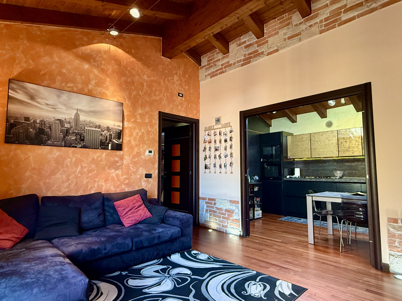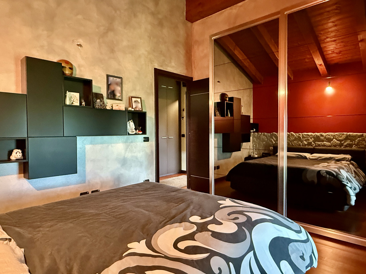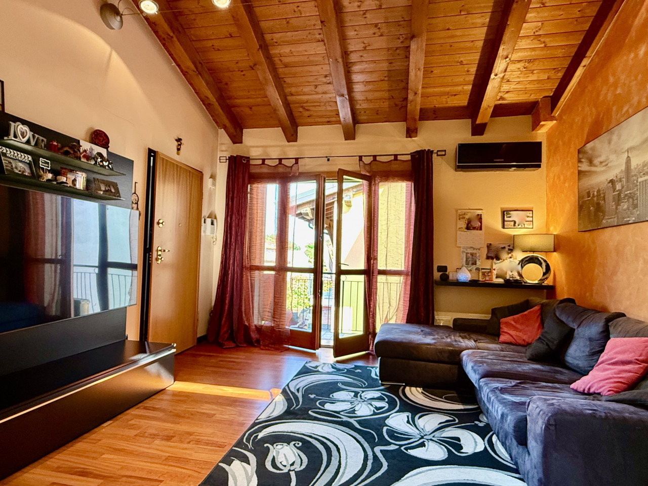 Le caratteristiche interne sono completate dal pavimento in parquet e dalla travatura a vista presente nell'intera abitazione, riscaldamento a pavimento, porte in legno lavorate, ed illuminazione a faretti che donano atmosfere calde agli ambienti. La presenza dei doppi split climatizzatori sia nella zona giorno che notte assicura massimo confort tutto l'anno.