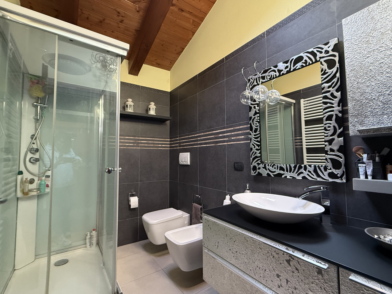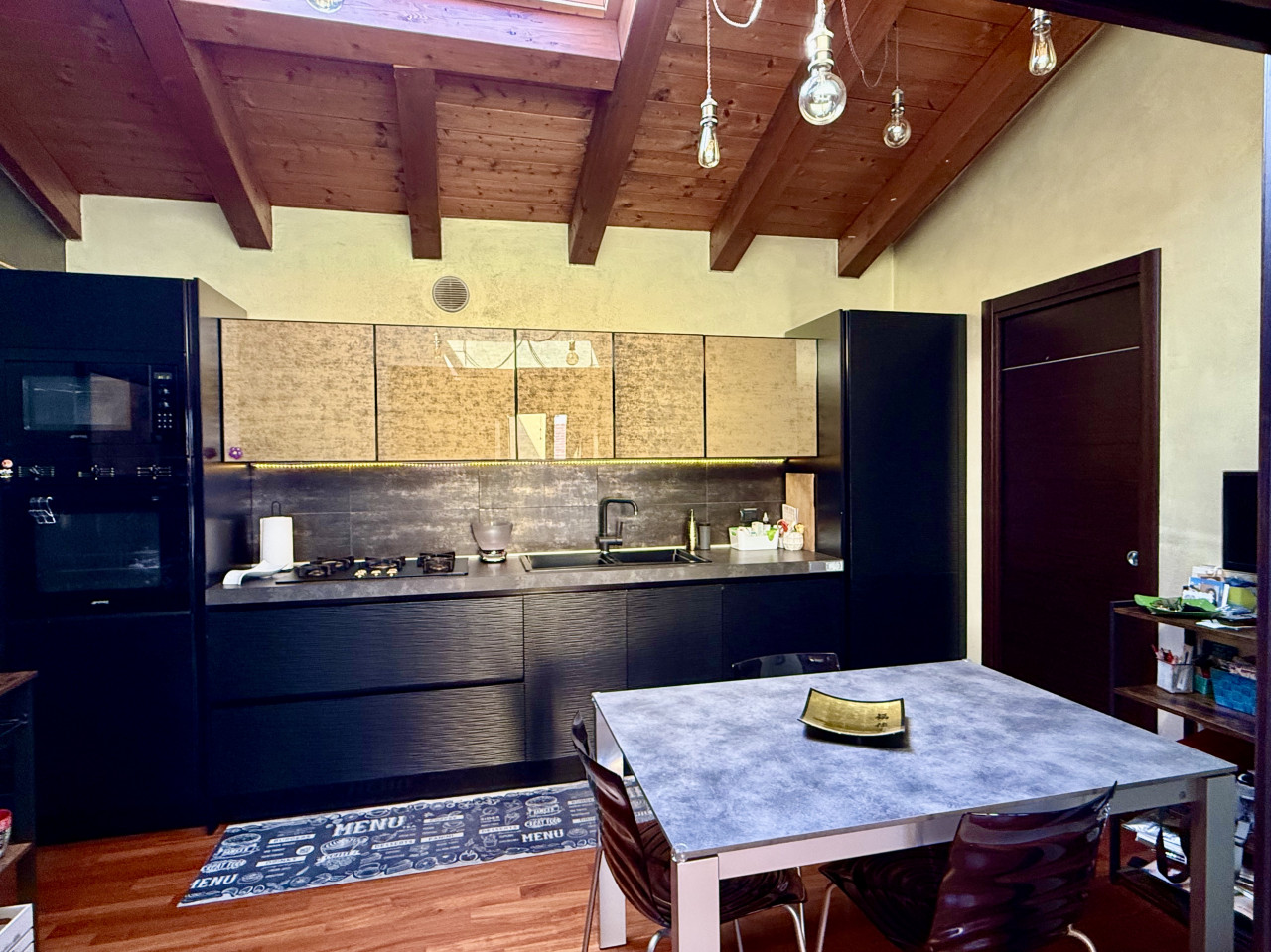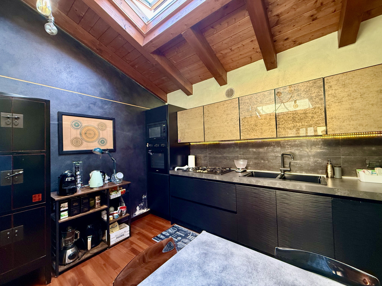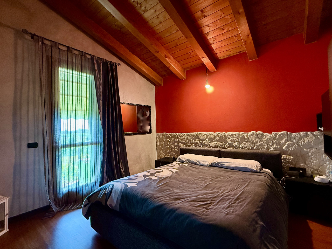 Le caratteristiche interne sono completate dal pavimento in parquet e dalla travatura a vista presente nell'intera abitazione, riscaldamento a pavimento, porte in legno lavorate, ed illuminazione a faretti che donano atmosfere calde agli ambienti. La presenza dei doppi split climatizzatori sia nella zona giorno che notte assicura massimo confort tutto l'anno.