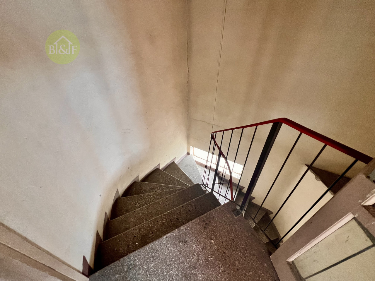 Al piano seminterrato sono presenti cantina e locale tecnico. Gli appartamenti sono circa 90 metri ciascuno, il primo e il secondo piano sono speculari: ciascun appartamento è composto da due camere da letto, soggiorno con ripostiglio e comoda uscita su balcone, cucina abitabile, bagno ed eventuale terza camera. Il piano attico è composto da una spaziosa veranda con affaccio sulla via principale, cucina, bagno, ripostiglio e camera da letto, con possibilità di ricavare una seconda camera nella veranda. Le soluzioni necessitano di una completa ristrutturazione, ideali per chi cerca un ottimo investimento in pieno centro. Possibilità di installare un ascensore interno per collegare i vari piani.